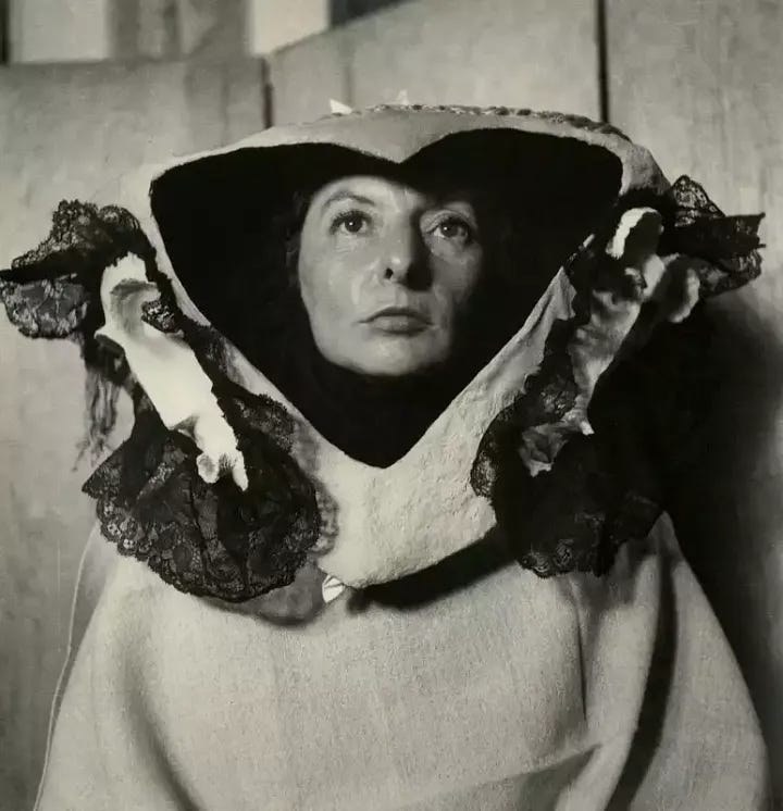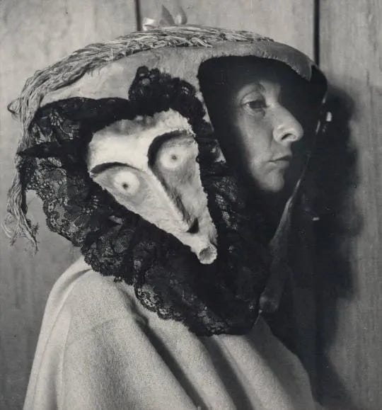 One striking scene evoked photographs of Remedios Varo taken by Kati Horna. In the black and white picture, Varo wears a mask made by Carington, their mutual friend. The front of the mask is hollow, allowing us to see Varo, and in the photos of her in profile, we can clearly see another face on her right side. It makes sense if you have seen Keeper, trust me.