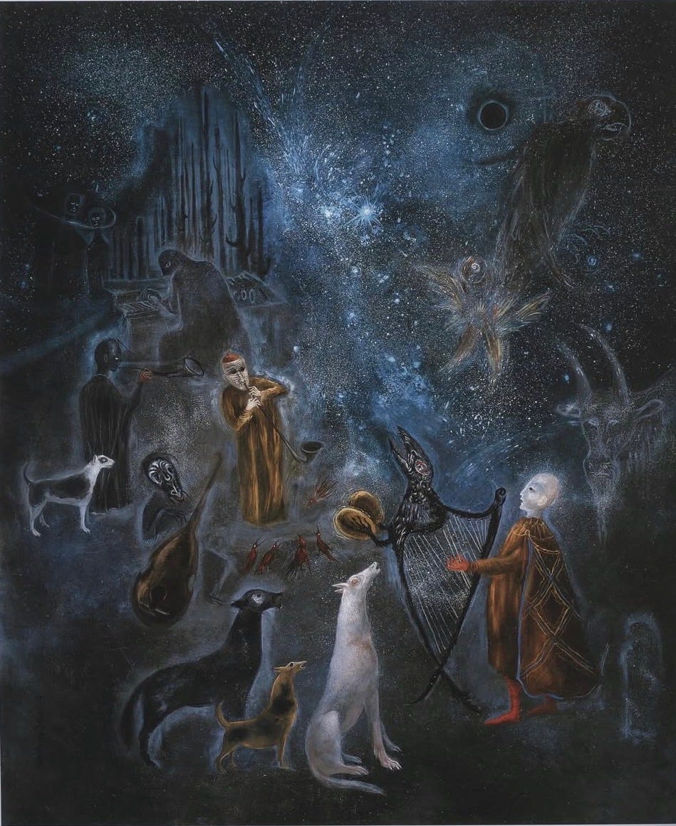 One of Carrington’s later works—made during the last decade of her life—is a truly magical painting as animals from her psyche gather to listen to musicians playing what appears to be a nighttime concerto. Even the showy figures lurking in the back are joining in. The work fuses so many of Carrington’s influences—Celtic folklore, mysticism, mythology, animal transformation, spiritual deities and messengers, and the realm of the unexplainable. I read somewhere that it’s a fusion of the magic and the mundane, and while it’s never mundane with Carrington, isn’t that just the best explanation of life?